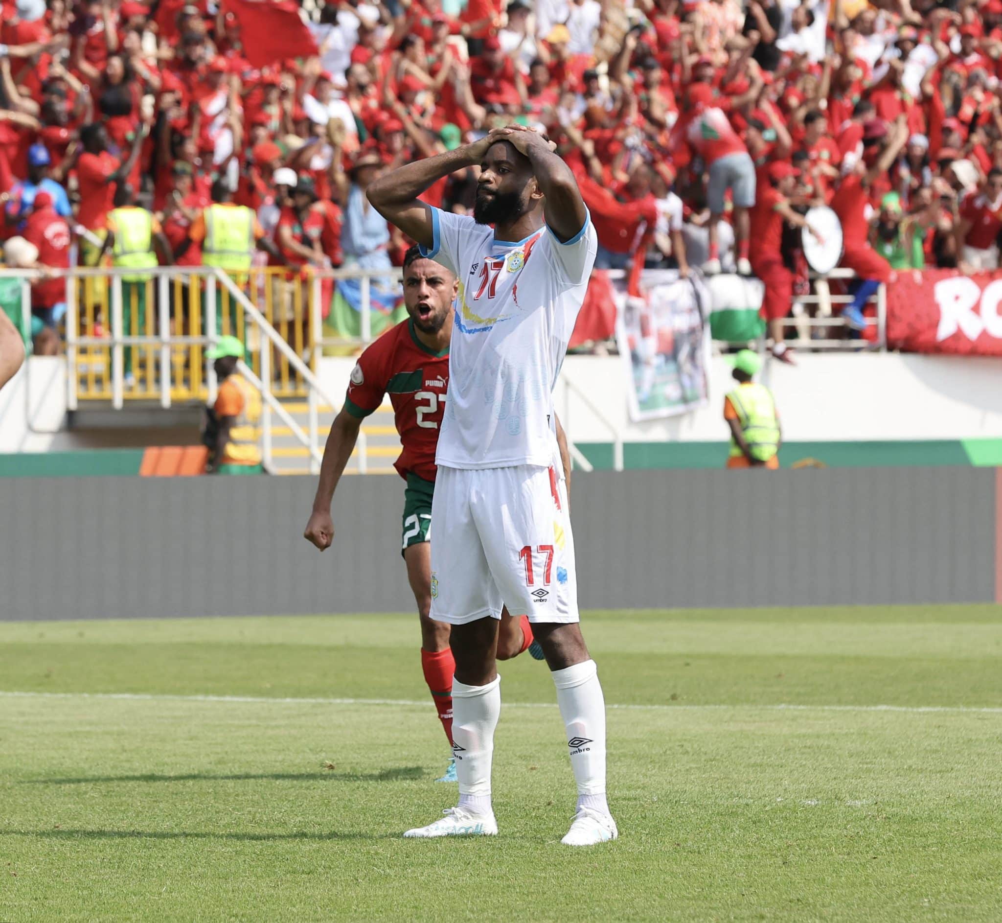 No fim, a seleção que estava perdendo quase empatou em uma perigosa cobrança de falta lateral. Saïss de novo brilhou com um corte que tirou a possibilidade de Chancel Mbemba emendar para o gol. No entanto, na primeira trave, Selim Amallah subiu com o braço muito alto, parece ter triscado na bola e ainda acertou o cotovelo na cabeça de Henoc Inonga – que sofreu um corte e precisou jogar enfaixado. O árbitro precisou da ajuda do VAR para marcar a penalidade. Porém, Bakambu fez toda uma pose, foi para cobrança e mandou no pé da trave, evitando o empate dos Leopardos aos 42 minutos.