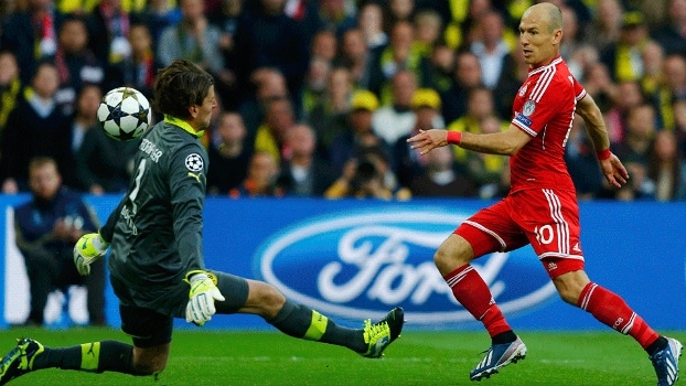 A temporada de 2012/13 nem foi tão boa assim para Robben, a bem da verdade. O ponta sofreu com os problemas físicos, para variar, e perdeu boa parte do segundo semestre de 2012. Foi um mero coadjuvante na Bundesliga, sem disputar metade dos jogos. Mas cresceu no momento certo, especialmente na Champions. O holandês marcou gols nos dois jogos contra o Barcelona pelas semifinais. Já na decisão, Robben teria uma revanche particular com o Dortmund. Na temporada anterior, o ponta também havia perdido um pênalti contra os aurinegros. Ficou marcada a imagem de Neven Subotic partindo para cima do holandês para falar poucas e boas em seu ouvido.