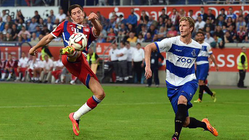 Foi no empate por 1 a 1 no amistoso contra o Duisburg. Lewandowski abriu o marcador com um belo gol. Recebeu o lançamento em profundidade de Rafinha, dominou e bateu. Dois toques na bola e pronto.
