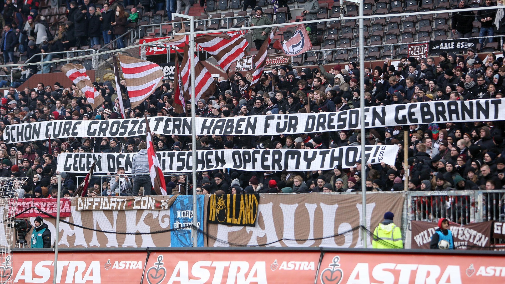 Publicamente, o St. Pauli se retratou sobre a polêmica na partida, que terminou com vitória por 2 a 0 para a equipe de Hamburgo. “Embora o St. Pauli não compactue com a ideia sobre a vitimização alemã, que foi propagada no passado especialmente por nacionalistas e populistas de extrema-direita, e expressamente apoie e desafie um tratamento crítico da história alemã, as palavras escritas nas faixas foram longe demais. Elas zombam das vítimas do bombardeio aéreo de Dresden. Pelo comportamento de seus torcedores, o St. Pauli pede desculpa ao Dynamo Dresden, sua torcida e todos que estão ligados às vítimas dos ataques que ocorreram há 72 anos. O posicionamento da primeira faixa não está de acordo com o que pensa o St. Pauli, em termo de conteúdo e de escolha de palavras”, diz o comunicado.