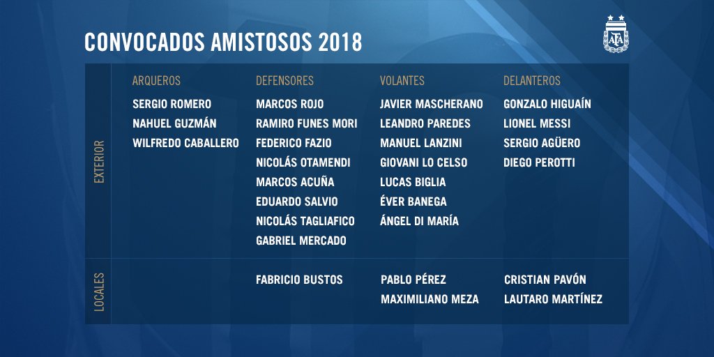 Jorge Sampaoli complementou nesta segunda a última convocação da Argentina antes da lista final para a Copa do Mundo. O treinador já tinha chamado os jogadores de clubes estrangeiros e, desta vez, integrou também aqueles que atuam no campeonato local. Não há grandes surpresas, apesar das novidades. Lautaro Martínez, novo xodó do país, arrebentando com a camisa do Racing, ganhou a primeira chance. Além disso, o treinador se mostra atento com os momentos de Independiente e Boca Juniors. São duas apostas vindas de cada clube, que talvez sejam úteis para compor o elenco rumo à Rússia.