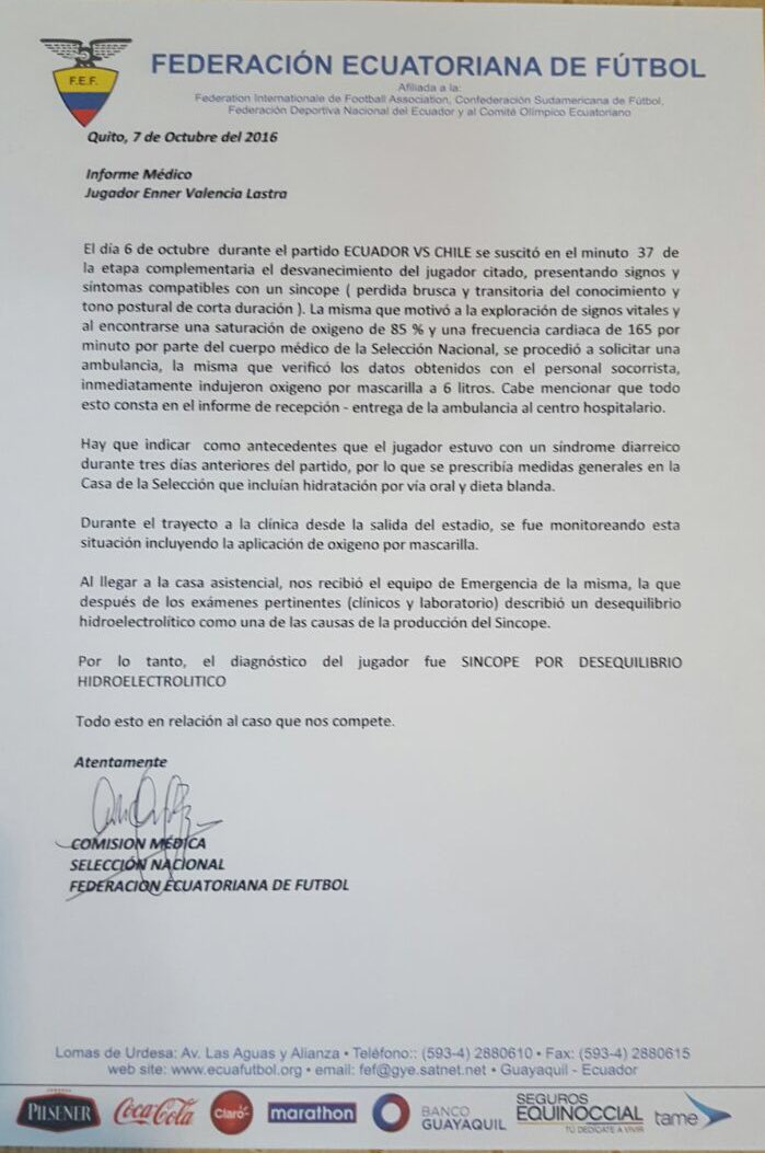 Valencia só ganhou alta na noite desta sexta, coincidentemente logo depois que o documento judicial foi validado e se retirou a custódia policial. Segundo o informe médico publicado pela Federação Equatoriana de Futebol, o atacante “apresentava sintomas compatíveis com uma síncope”, com perda brusca e transitória do conhecimento, além de taxas baixas de oxigênio e taquicardia. O documento também afirma que o jogador teve uma diarreia nos três dias anteriores ao jogo da seleção, e a desidratação causou a síncope. Ele teria permanecido por tanto no hospital para realizar exames e tomar a medicação pertinente.