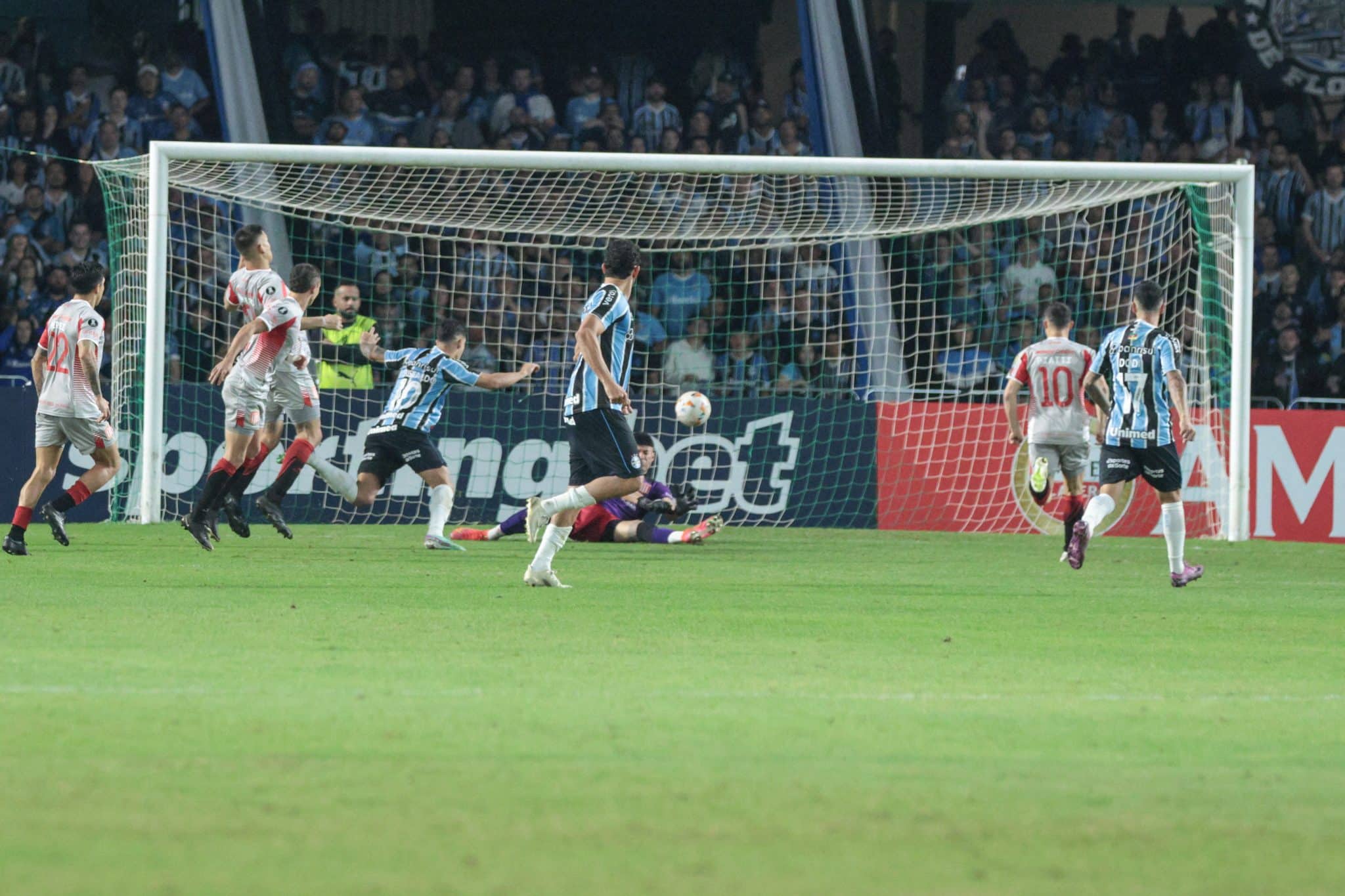 Artilheiro do Grêmio na temporada, agora com nove gols, Cristaldo recebeu lindo passe de Diego Costa, por debaixo das pernas de Enzo Pérez. O camisa 10 tricolor invadiu a área e finalizou na saída de Mansilla, que conseguiu tocar com o pé esquerdo na bola, mas não evitou que ela entrasse lentamente no canto esquerdo.