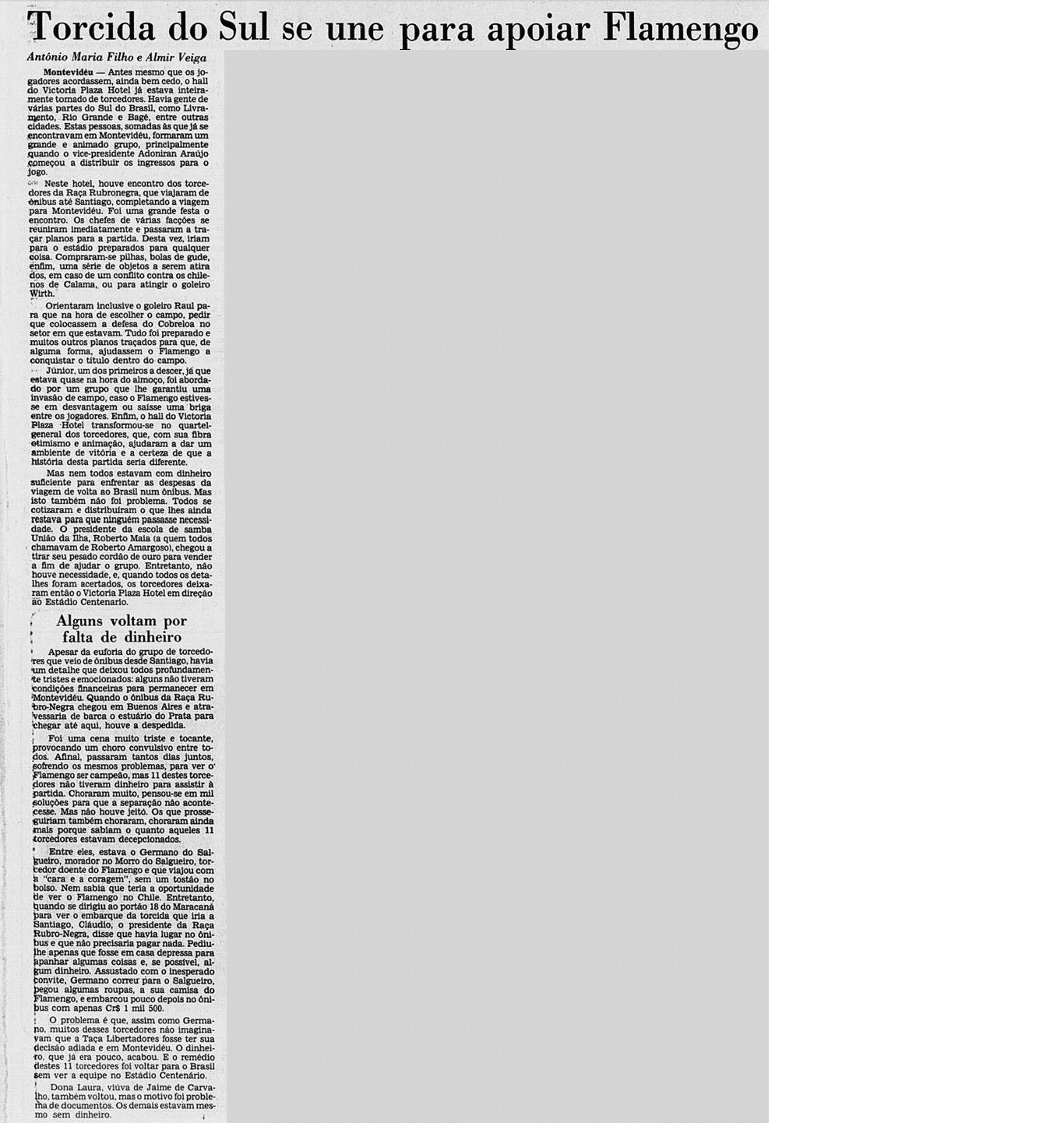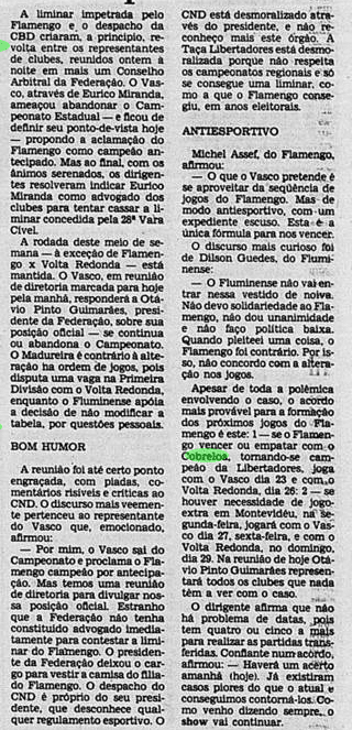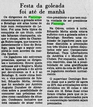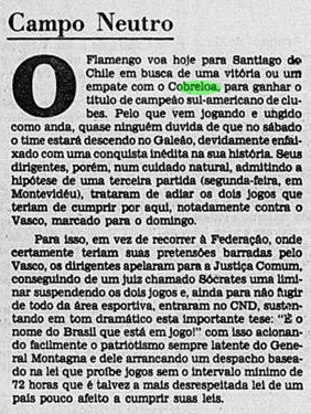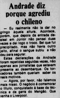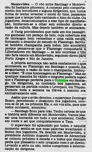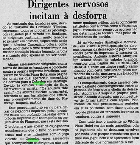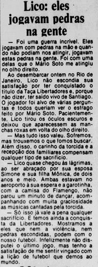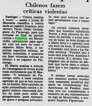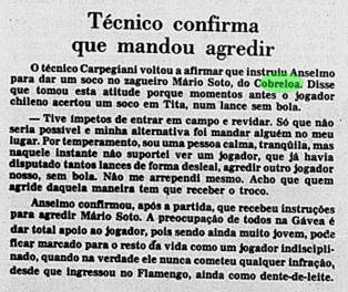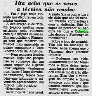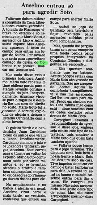 Curiosamente, a imprensa deu uma atenção bem menor que a necessária ao valor da Libertadores. A menos de um mês do Mundial, já traçavam o duelo contra o Liverpool. Os jogadores mal tiveram tempo de comemorar, sem desfile em carro aberto, já que o Campeonato Carioca também vivia sua fase decisiva. E o debate inescapável era sobre a agressão de Anselmo, com a culpa admitida por Carpegiani.
