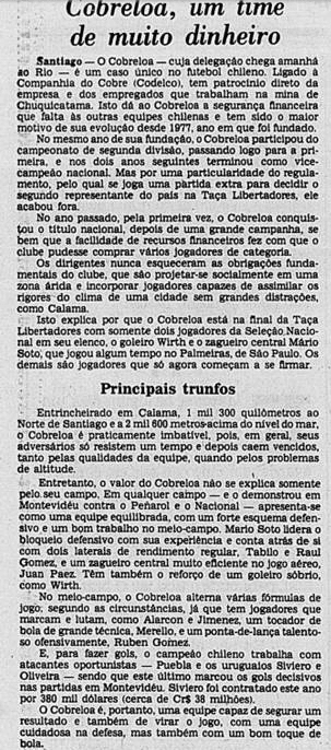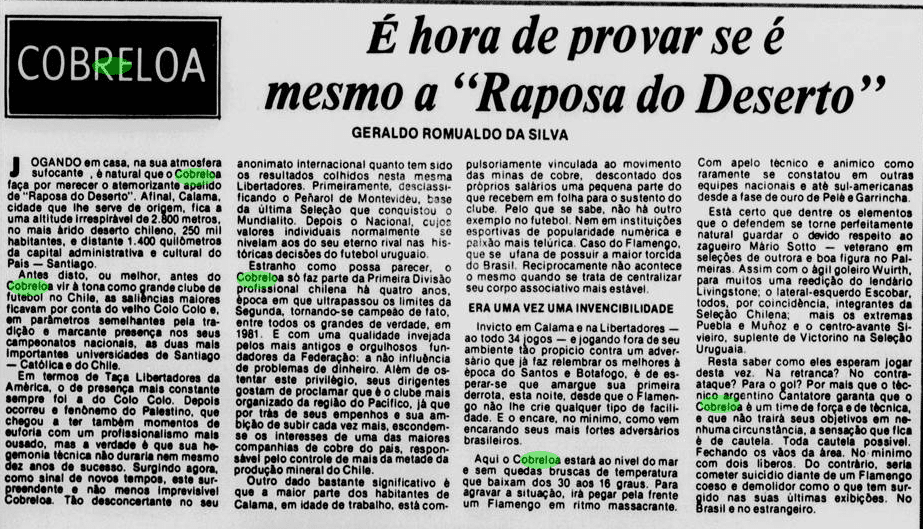 Força ascendente no Chile, o Cobreloa contava com o patrocínio da Codelco, a estatal responsável pela exploração do cobre no país. Havia um nacionalismo ao redor da campanha, inflamado pelo regime de Augusto Pinochet, e o pequeno clube do norte lotaria o Estádio Nacional com a ajuda das demais torcidas. E, a despeito de alguns bons jogadores, os Zorros del Desierto fizeram muito mais fama por sua violência. Os jogos contra o Flamengo seriam lembrados como verdadeiras batalhas, especialmente por aquilo que se viveu em Santiago e no jogo-desempate realizado em Montevidéu.