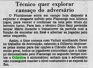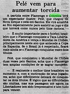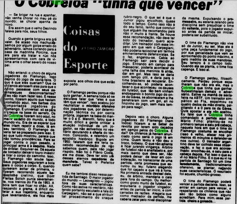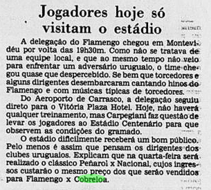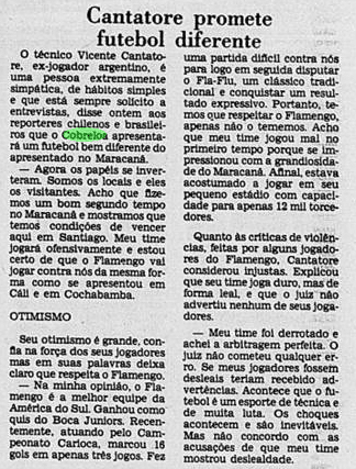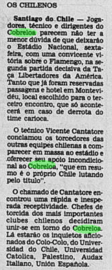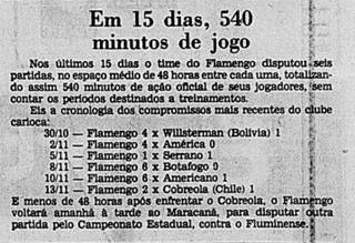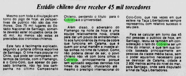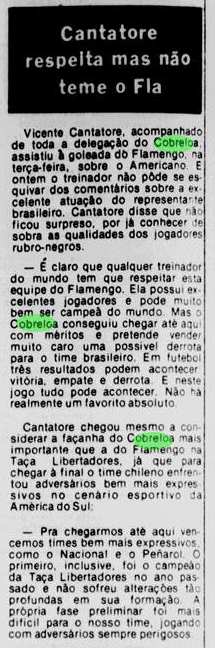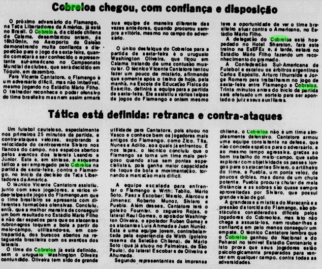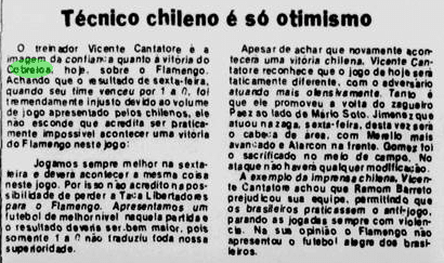 O Flamengo vinha de uma imponderável goleada por 6 a 0 sobre o Botafogo no Campeonato Carioca. Era o grande assunto nos jornais. O problema é que o time não tinha muito tempo para festejar. No dia 11, já encarava o Americano pelo Carioca. Além disso, o Cobreloa provocava o interesse na imprensa, às vésperas de desembarcar no Brasil.