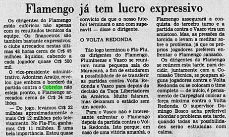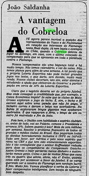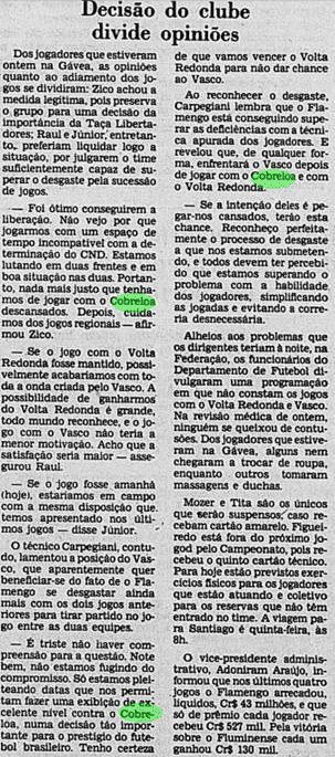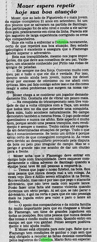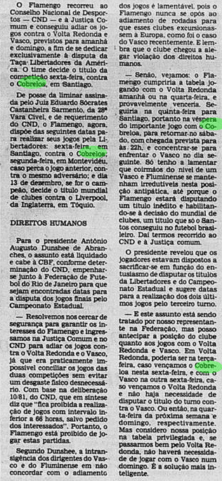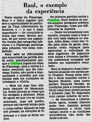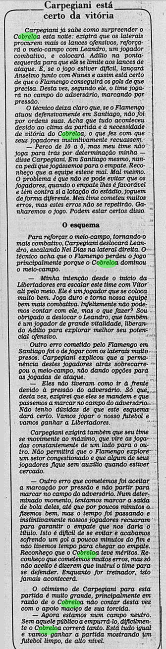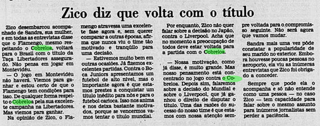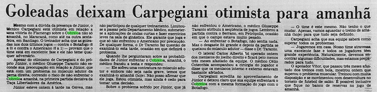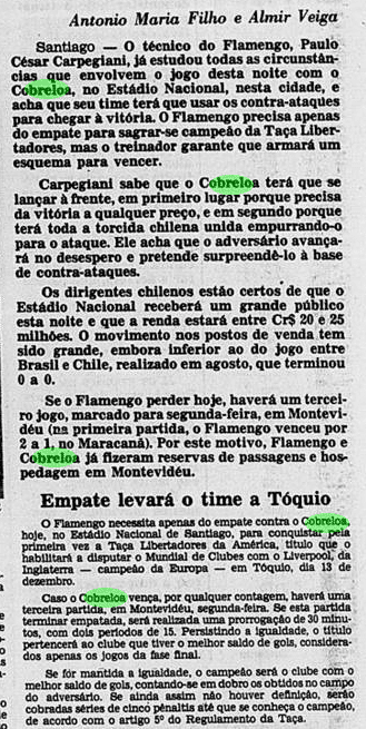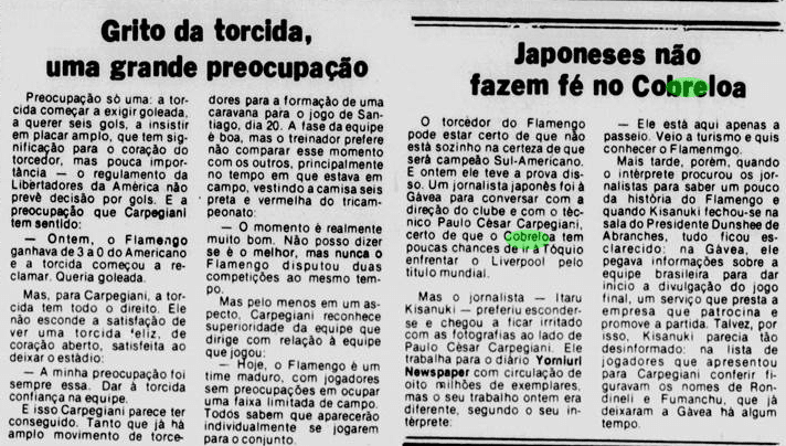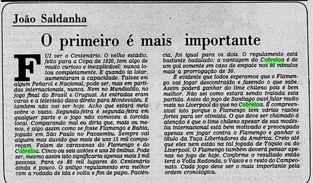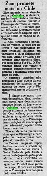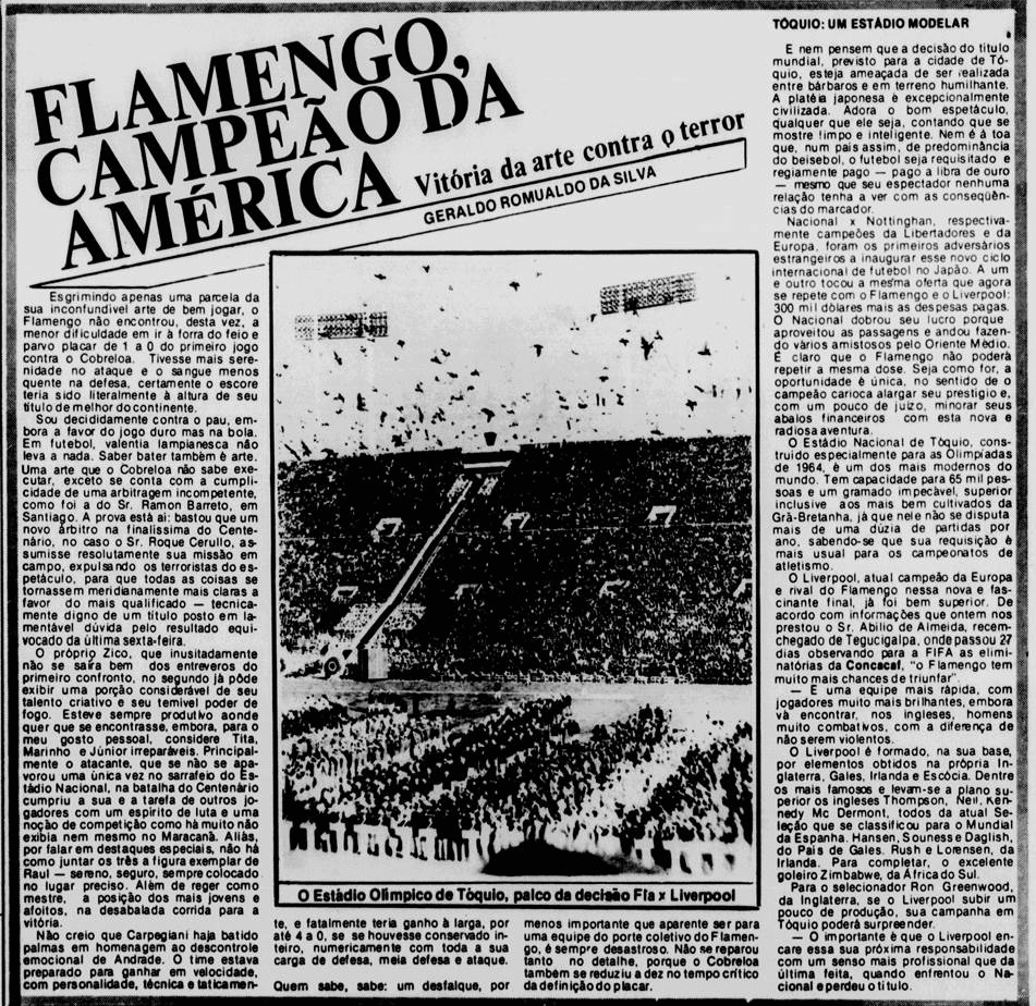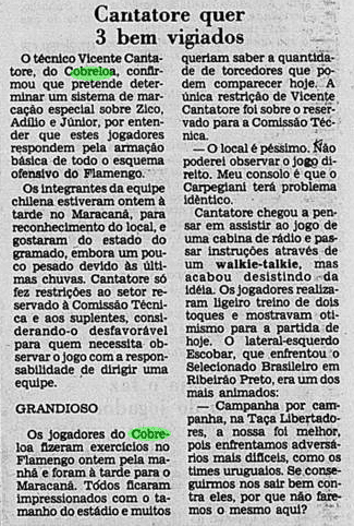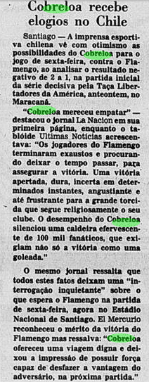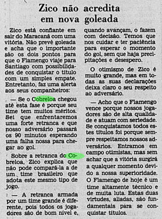 E a verdade é que o calendário tirou um pouco do peso da Libertadores ao Flamengo. Não houve muito tempo para sentir o gosto da conquista, tanto pelo Carioca que não dava sossego, quanto pelo Mundial que se tornava logo o grande objetivo. De certa maneira, a vitória sobre o Cobreloa serviu de ponte ao mês mágico vivido pelos rubro-negros. Talhou os jogadores a partidas duras e resultou em três taças enfileiradas em pouquíssimo tempo.