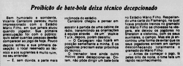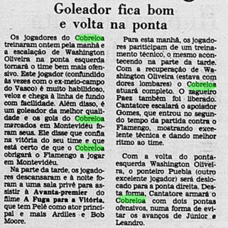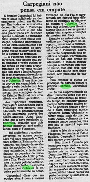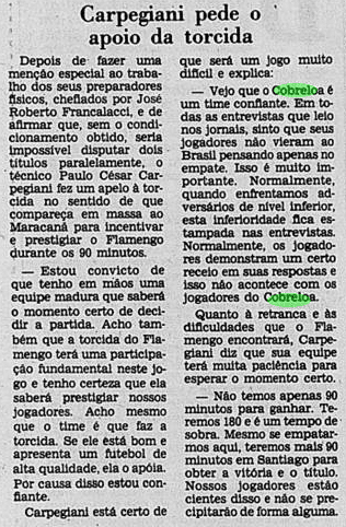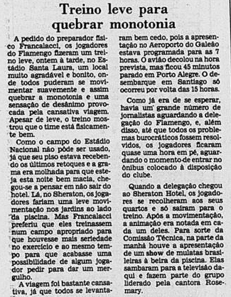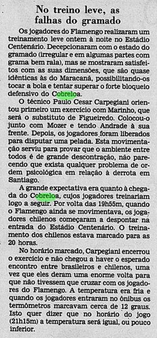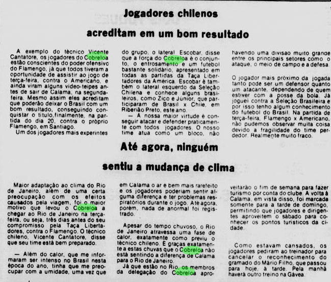 O Flamengo pegava leve nos treinamentos, em um dia de forte chuvas no Rio de Janeiro. Carpegiani declarava sua confiança após as goleadas recentes. Já o Cobreloa começava a intensificar suas atividades, com um treino na Urca. Adaptar-se ao nível era um desafio aos chilenos.
