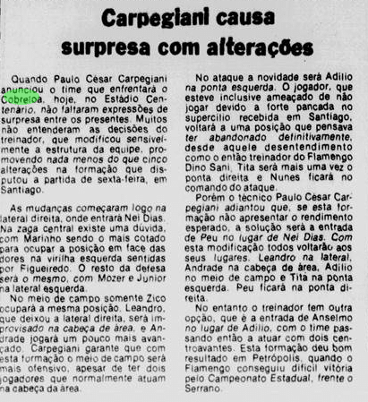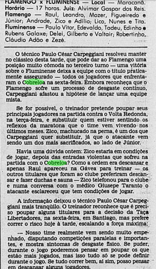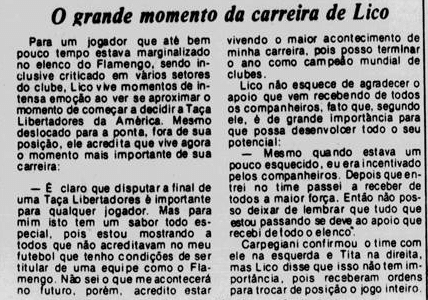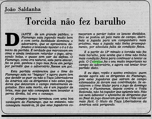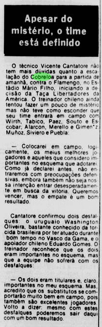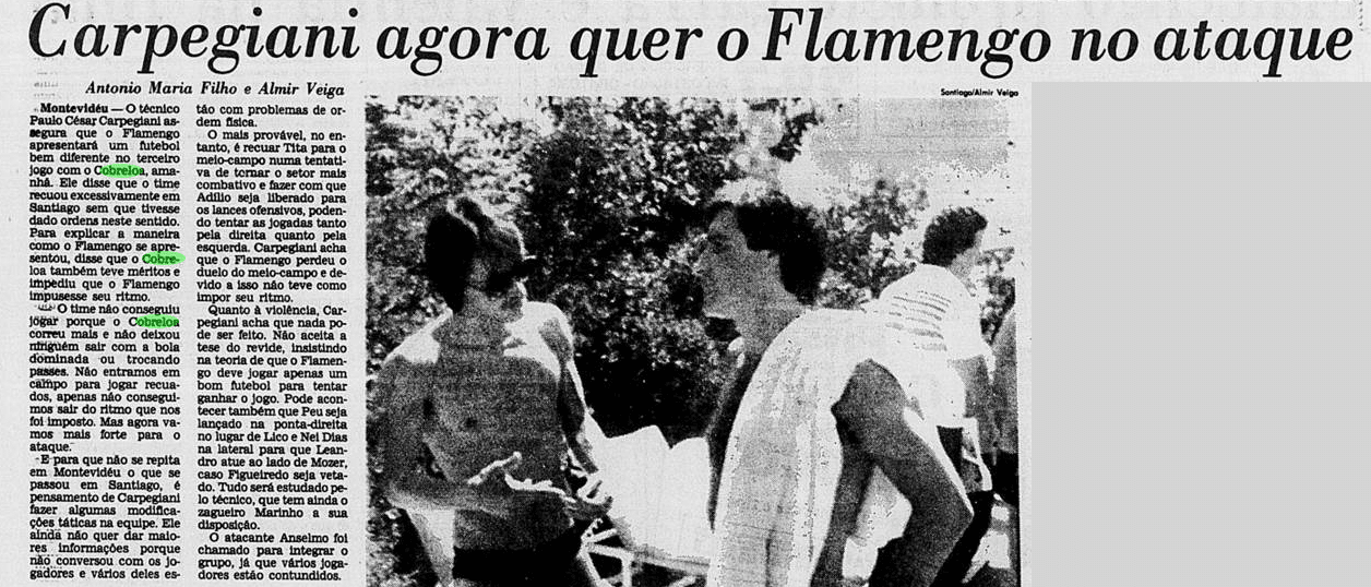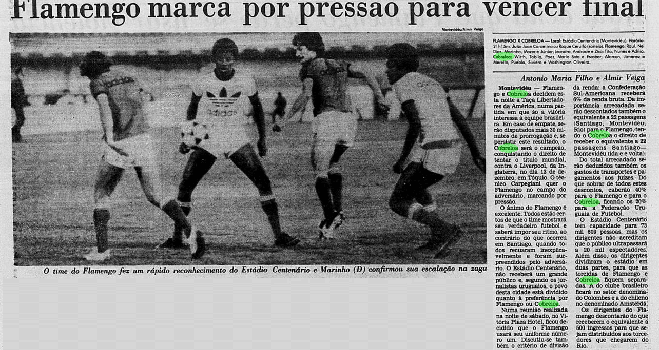 Com os 40 anos da conquista e às vésperas de mais uma final continental, relembramos um pouco como foi esse passado – em texto originalmente produzido em 2019. Abaixo, dia a dia, tentamos retratar um pouco das expectativas ao redor da final e do clima nos jogos. Cada data possui um curto resumo, que introduz os recortes das notícias do Jornal do Brasil e do Jornal dos Sports (ambos veículos cariocas) referentes ao que aconteceu naquele dia. Para viajar no tempo: