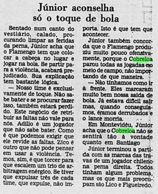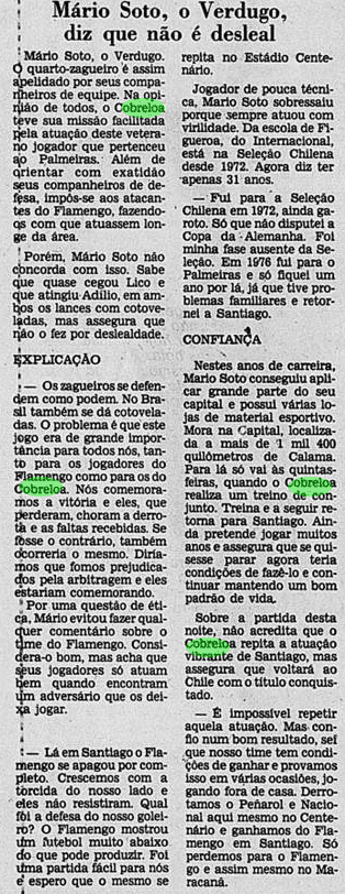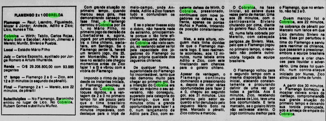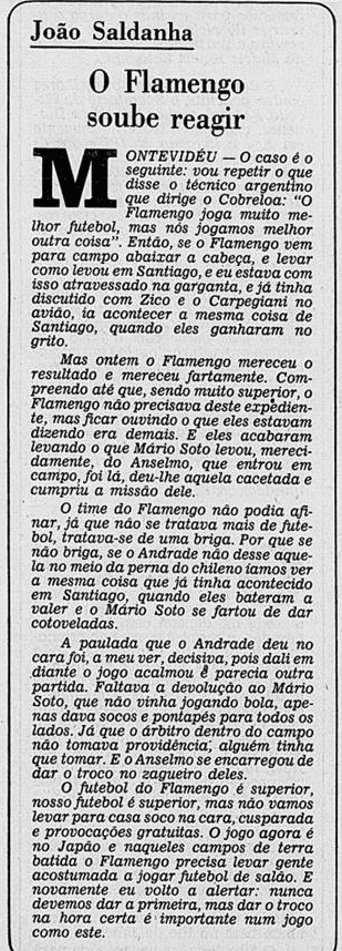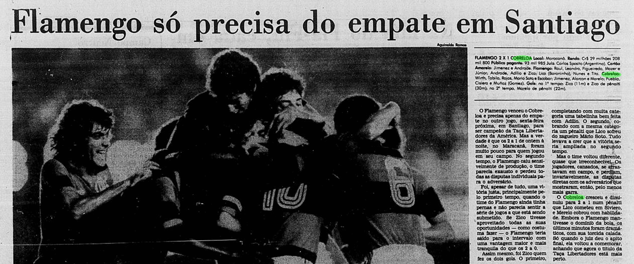 O Flamengo era superior e jogou melhor que o Cobreloa na somatória das partidas. Contou com um Zico decisivo, um Adílio inspirado, um Raul seguro, um Tita confiante e outros tantos destaques daquele esquadrão. Os rubro-negros fizeram sua parte no Rio de Janeiro e dominaram a partida no Centenario para erguer a taça. Mas também partiram à vingança na pancada, em revide que marcaria o último duelo. O jogo sujo de Mario Soto, o grande “vilão” dessa história aos flamenguistas, seria correspondido de maneira igualmente desleal por Anselmo. Apesar dos méritos com bola rolando, a brutalidade roubou parte dos holofotes.