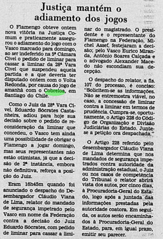 Em meio a tudo que acontecia, o Flamengo ainda precisou lidar com uma disputa nos tribunais. O clube acionou uma resolução do Conselho Nacional de Desportos para adiar as partidas contra Volta Redonda e Vasco pelo Carioca. O duelo contra o Voltaço era na quarta; o clássico com o Vasco, no domingo. No meio de ambas, a segunda final contra o Cobreloa, em Santiago. Os rubro-negros alegavam que o intervalo mínimo de 66 horas não estava sendo respeitado, sobretudo pela viagem no meio. Os vascaínos ameaçaram até abandonar o Carioca.