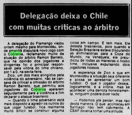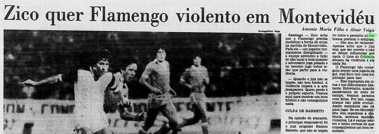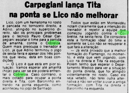 Flamengo podia jurar o Cobreloa de vingança, mas também precisava se acalmar e jogar bola. Era esse o principal desafio antes do reencontro em Montevidéu, que definiria o título numa segunda-feira. Por terem marcado um gol fora de casa, os chilenos conquistariam a taça caso o empate persistisse na prorrogação – em tempos nos quais não existia disputa por pênaltis na Libertadores. Lico foi vetado pelo departamento médico, mas preferiu seguir com a delegação. E um fotógrafo queria processar Júnior, acusando o lateral de agressão.