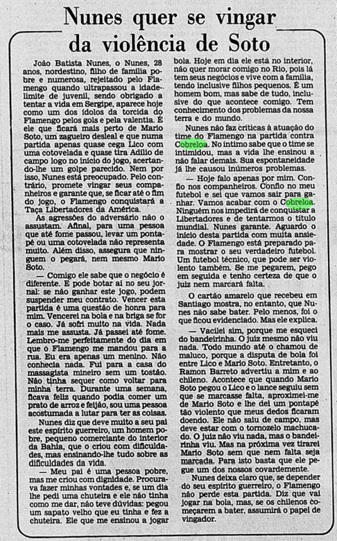Apesar do discurso, o segundo jogo esteve longe de guardar a segurança mencionada pelo Flamengo. E não foi apenas na bola que os rubro-negros perderam no Estádio Nacional. Eles também tomaram uma surra dos jogadores chilenos, com a complacência do árbitro. Lico foi quem mais apanhou, com uma lesão séria no olho, enquanto Adílio estava ensanguentado por causa de um corte no supercílio. Mario Soto liderava a pancadaria, usando até pedras, em coleção de erros de arbitragem que prejudicaram o Fla. Já na bola, o triunfo por 1 a 0 nasceu graças a uma cobrança de falta de Merello que desviou em Leandro. Contido na defesa, o time de Carpegiani não fez uma boa apresentação e dependeu de Raul e Mozer, destaques na noite.