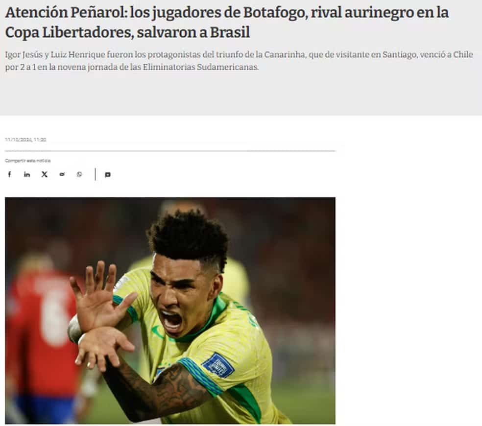Se a Seleção Brasileira contou com a ajuda do Botafogo para vencer o Chile em Santiago, os alvinegros se sentiram retribuídos com a repercussão do destaque dos seus atletas. Igor Jesus e Luiz Henrique puxaram a fila de elogios no Uruguai, que também foram acompanhados por pedidos de atenção ao Peñarol.