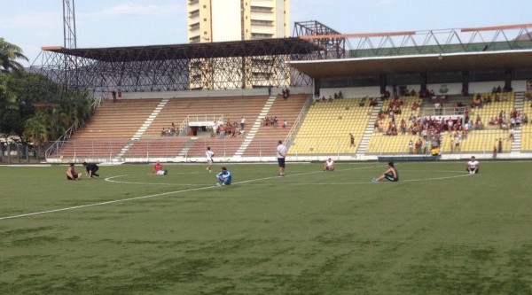 A foto acima foi tirada antes da partida entre Trujillanos e Deportivo Lara, disputada no Estádio José Alberto Pérez, em Trujillo – estado onde aconteceram as primeiras manifestações contra Maduro. Minutos antes do início da partida, um grupo de pessoas invadiu o gramado e ocupou uma das áreas do campo, em motivo ainda não esclarecido se em apoio ao que acontece nas ruas ou contra a postura da federação. Depois de meia hora de atraso, o presidente do clube chegou a um acordo e, aí sim, o duelo começou, com jogadores sub-20. Já na partida entre Carabobo e Estudiantes de Mérida, também em Trujillo, a situação foi mais radical. O público se recusou a sair do campo e o jogo foi suspenso por falta de segurança.