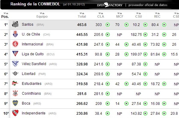 O título deu a liderança ao clube da baixada santista, que deixa para trás a Universidad de Chile em segundo e o Internacional, campeão da Libertadores em 2010, em terceiro. A LDU, do Equador, está em quarto lugar, seguida por Vélez Sarsfield-ARG, Libertad-PAR, Estudiantes-ARG, Continthians, Boca Juniors-ARG e Independiente-ARG, que volta a figurar entre os dez primeiros.