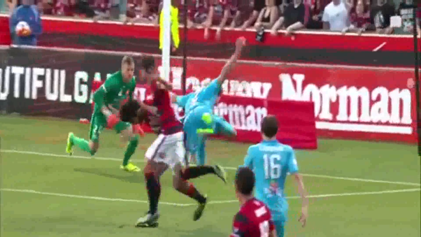 Michael Marrone ia em direção ao gol quando, dentro da área, tentou tirar o zagueiro Nikolar Topor-Stanley da jogada com um drible. Justo quando Marrone ia passando, Topor-Stanley interceptou o adversário. Para muita gente, especialmente o narrador da transmissão oficial, que afirmou aos berros que o defensor havia “catapultado o adversário para a estratosfera”, um pênalti claro não marcado. Para outras pessoas, não passou de uma simulação esfarrapada. Posteriormente, o próprio árbitro do jogo afirmou que errou ao não assinalar o lance.