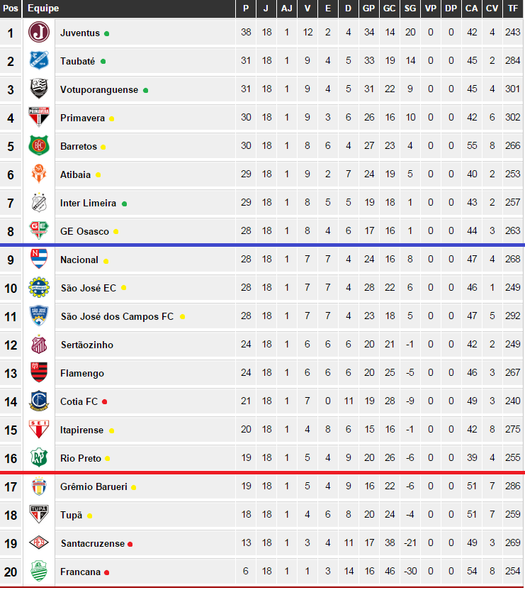 Já na parte inferior da tabela, quem se estapeia é Itapirense, Rio Preto, Tupã e Grêmio Barueri, todos tentando fugir da última vaga da degola. Francana, Santacruzense e Cotia já estão rebaixados.