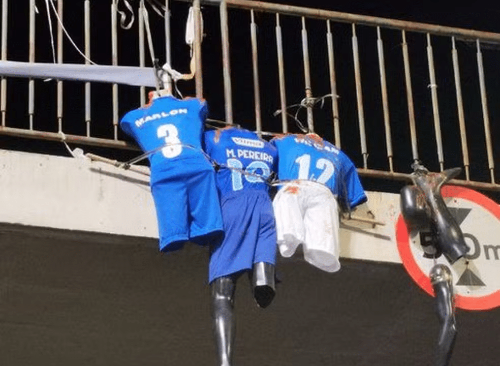 Após ser eliminado pelo América-MG no campeonato estadual, o Cruzeiro enfrenta uma crise com sua torcida. Nesta segunda-feira (24), foram pendurados três manequins sem a cabeça em um viaduto na capital mineira e com as camisas dos jogadores Matheus Pereira, Marlon e William, que estavam manchadas de vermelho para simular sangue.