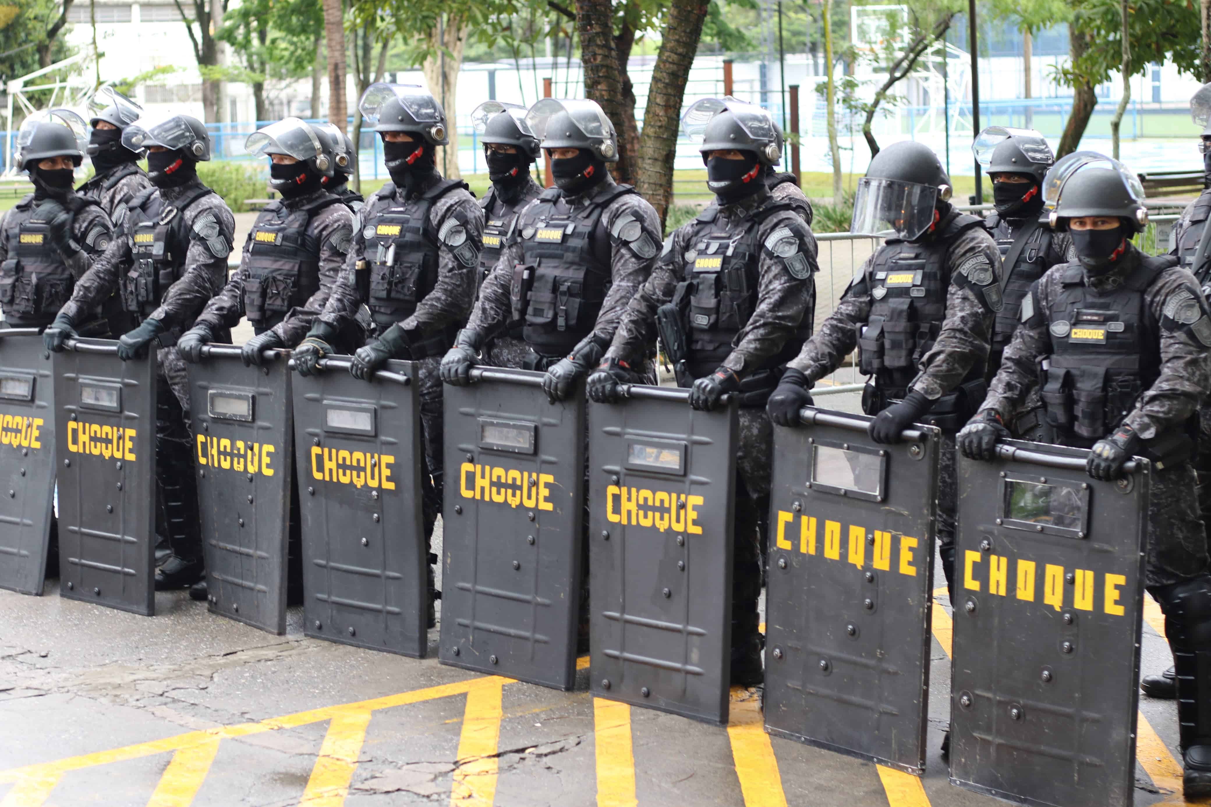 Seguranças por toda a parte, serviço de canil especializado com cachorros treinados e presença do batalhão de choque