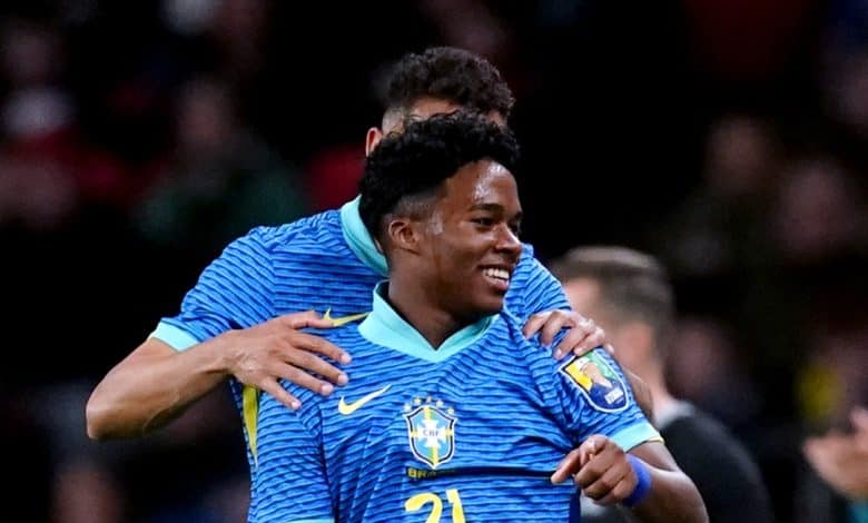 Se liga na comemoração de @endrick, autor do gol da vitória do Brasil contra a Inglaterra, em Wembley!