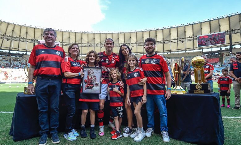 Começaram as homenagens. Filipe Luís já está no gramado do Maracanã para a reverência de companheiros, familiares e membros da diretoria.