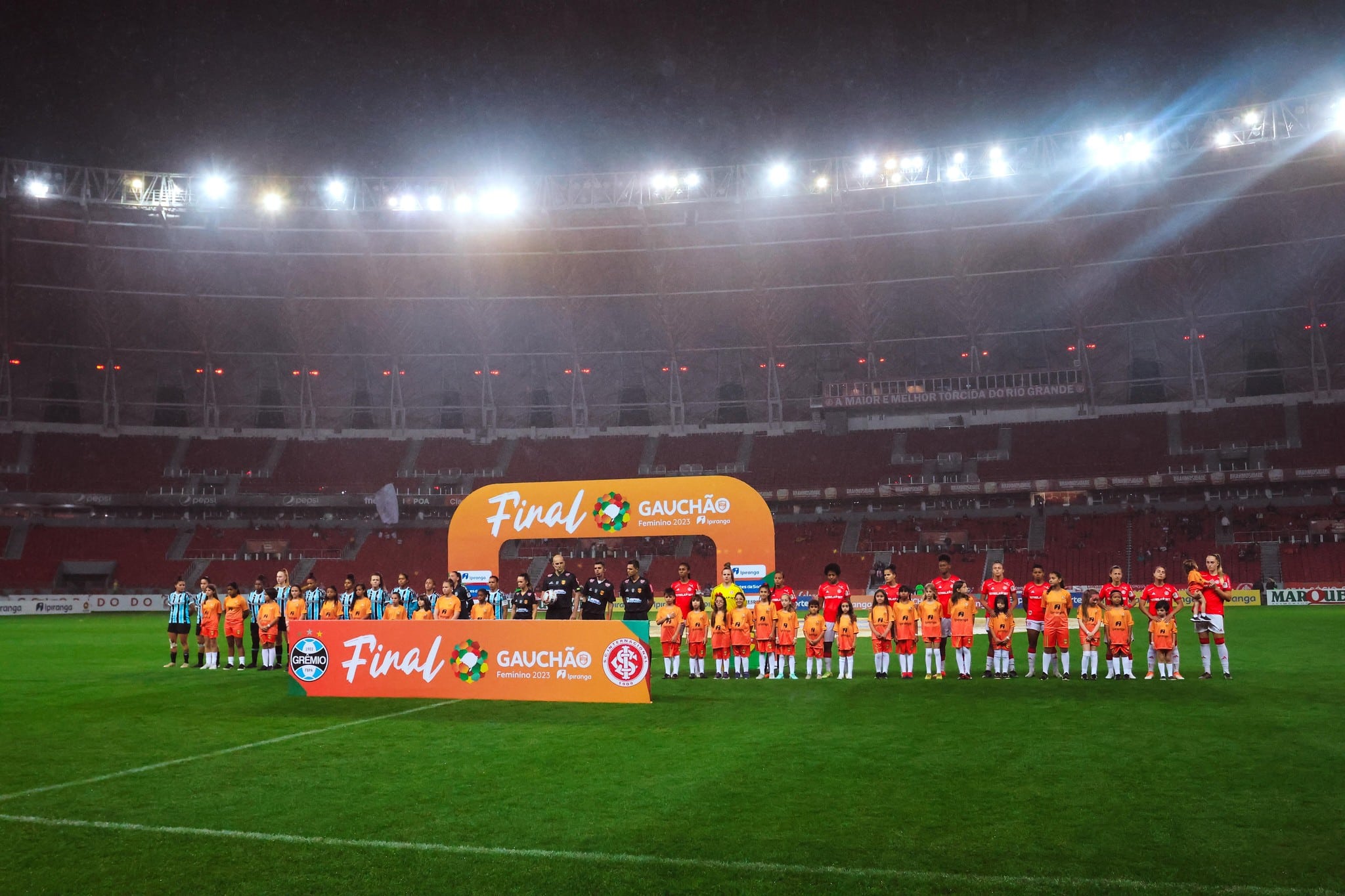 O desgaste do gramado ainda foi potencializado pelo jogo de ida da final do Campeonato Gaúcho de Futebol Feminino. Na noite de quarta-feira (22), sob chuva, as Gurias Coloradas venceram as Gurias Gremistas por 2 a 0, com gols de Priscila e Belén Aquino, e levaram vantagem para o jogo de volta, que acontece domingo (26), 10h30min, na Arena do Grêmio.