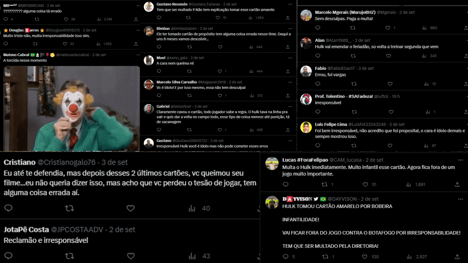 Desde que chegou ao Atlético, Hulk ganhou uma fama com as torcidas adversários: é sempre citado como um dos jogadores que mais reclama no Brasil. Com os cartões em 2023 sendo maioria por reclamação, o jogador deu cada vez mais justificativas para os rivais. Mas não só para eles. Os próprios torcedores do Atlético começaram a se irritar com as constantes reclamações do jogador. A atitude contra o Athletico-PR foi a gota d’água para muitos, que se irritaram nas redes sociais.