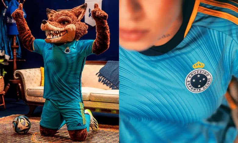 Modelo, que homenageia o Raposão, tem tons mais claros que o principal; os detalhes do novo uniforme do Cruzeiro aparecem em azul marinho e amarelo