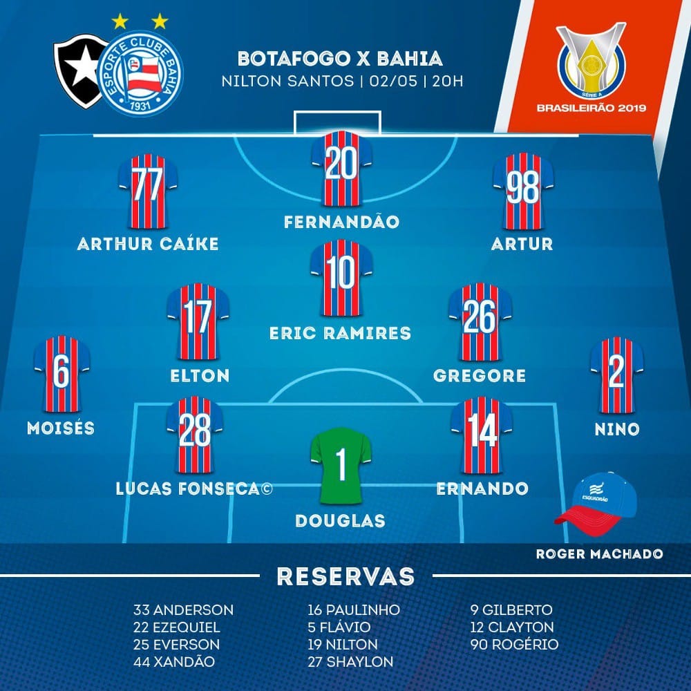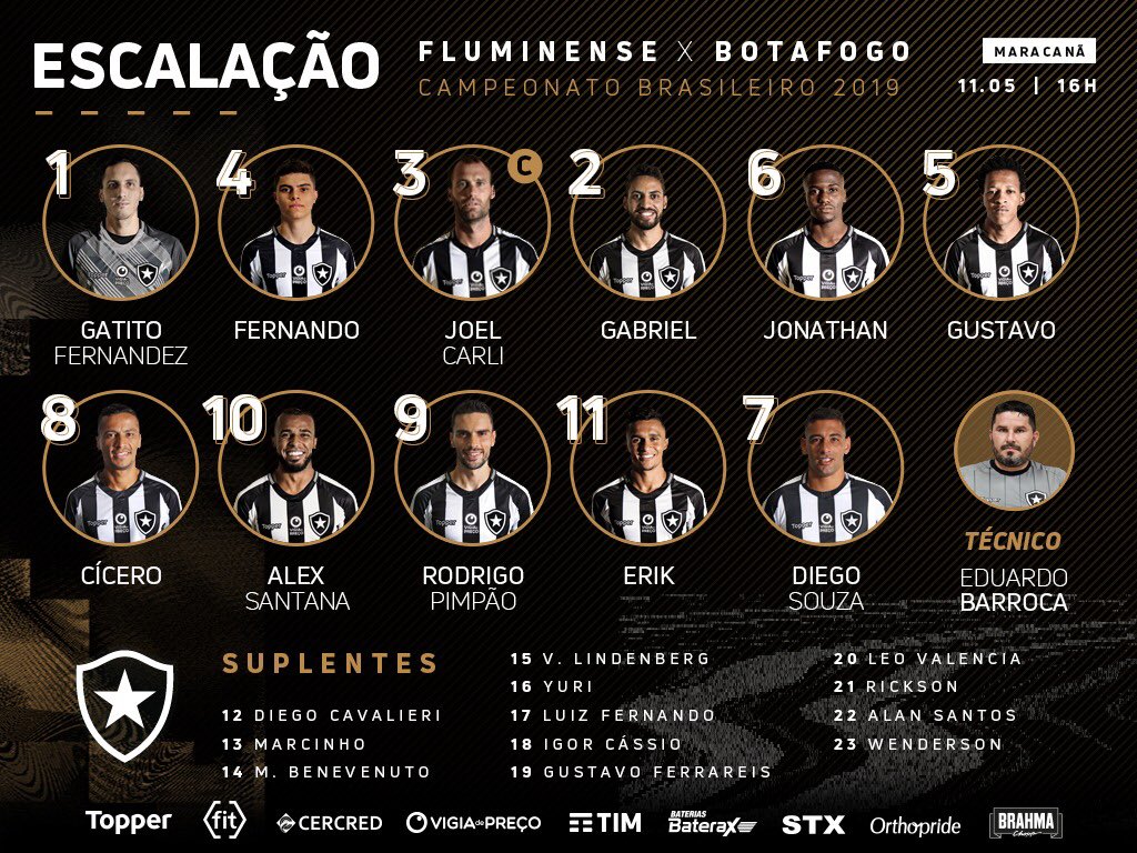 O Botafogo não tinha uma arte de divulgação da escalação até a postagem original desse texto, mas resolveram dar um jeito nessa lacuna a partir da quarta rodada — e não fizeram feio. A peça veio com cores caprichadas, fontes bem legíveis e grafismos ótimos que trazem uma leitura fluida, mesmo que a assimilação da coisa toda leve um pouco mais de tempo. Só pecaram na disposição e divulgação de algumas informações, mas o ponto fraco primordial é, por óbvio, o atraso.