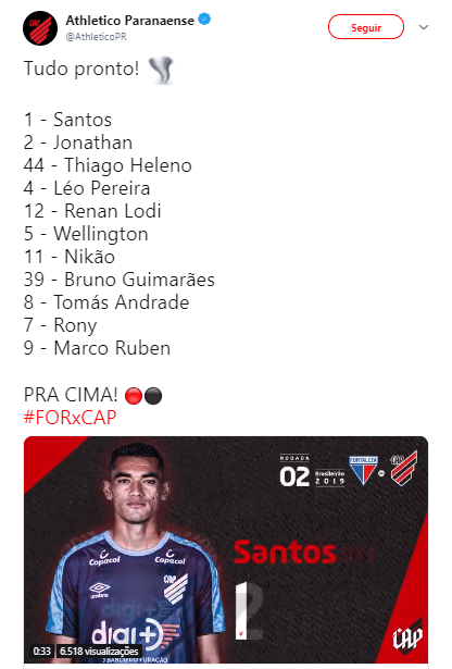 A opção por não usar uma imagem estática é tendência para quase todo tipo de conteúdo, mas não funciona para a escalação. Dificilmente o seguidor assiste ao vídeo até o fim, até porque já é possível ver os titulares no texto do post — ainda bem, afinal, imagine esperar quase um minuto para saber quem é que vai jogar na frente do seu time na rodada. Esse modelo também não traz algumas das informações essenciais, nem a perspectiva de formação tática. Os nomes no banco de suplentes só aparecem no tuíte seguinte.