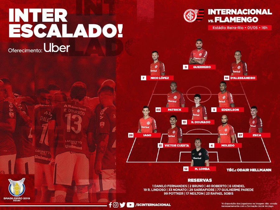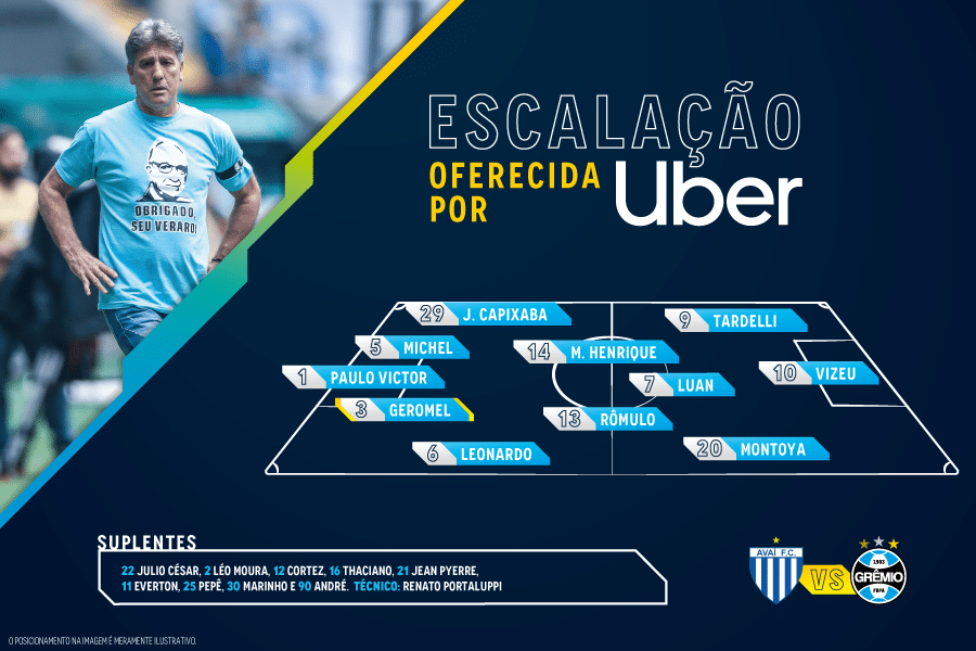 Layout bonito demais, pena que parece que a Uber é quem vai jogar. Pelo menos a disposição da equipe fica legal — menção honrosa para a indicação do capitão, em amarelo, que ficou show —, e os reservas são contemplados. Só faltou todo o resto.