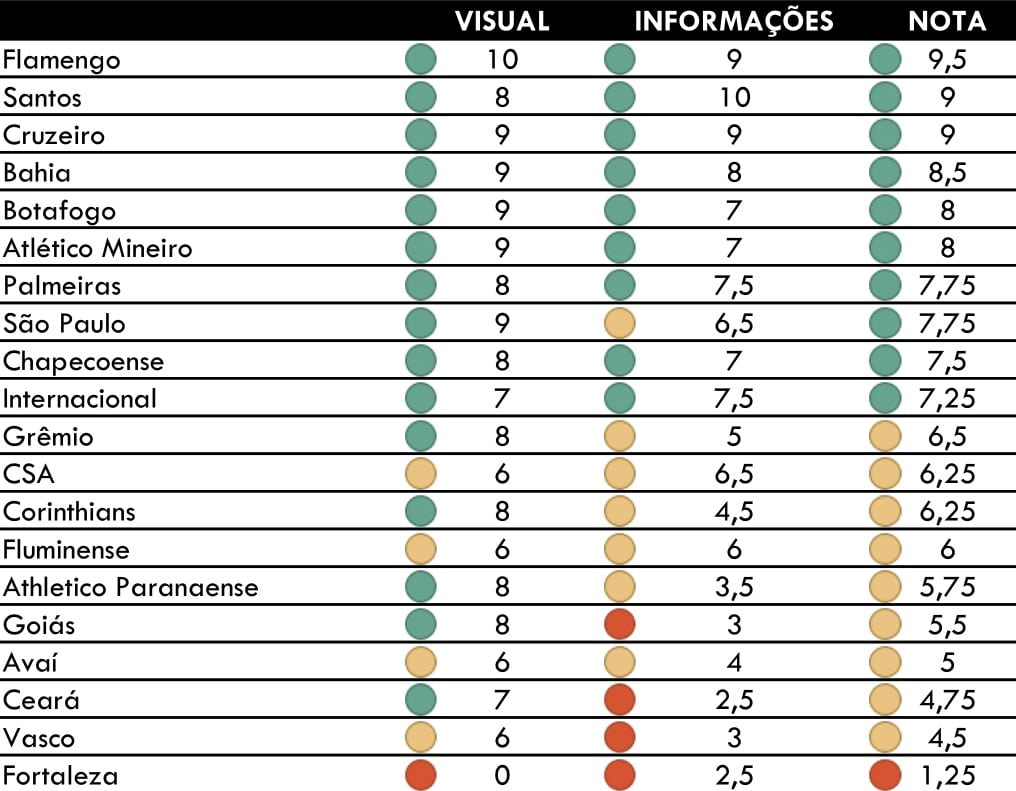 Já que não temos saldo de gols, o critério de desempate é a nota dada para as informações contidas na peça. Já para os que ainda assim seguiram empatados — no caso, Santos e Cruzeiro, Galo e Botafogo — , considerei o peso e valor das informações dentro da arte. O Cruzeiro incluiu o canal de transmissão e o número da rodada, por isso merece a dianteira. Já o Botafogo fica à frente por trazer fotos de todos os jogadores sem comprometer o entendimento do conteúdo, diferente do Atlético que só destaca um atleta por vez.