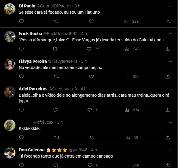 Vargas marcou apenas três gols em 2023. Coincidência ou não, em três jogos em que ele foi titular: Patrocinense, Democrata-GV e Internacional. No último deles, contra o Inter, há quase quatro meses, balançou as redes nos minutos iniciais e comemorou com as mãos na orelha, clássica celebração de quem quer atacar os críticos: “Eu estava precisando muito desse gol. Mas não ligo para o torcedor. É o nosso trabalho. Eles podem xingar, podem elogiar, mas eu não ligo. Eu sempre estou com a cabeça boa e continuo trabalhando”, disse no intervalo da partida em questão.