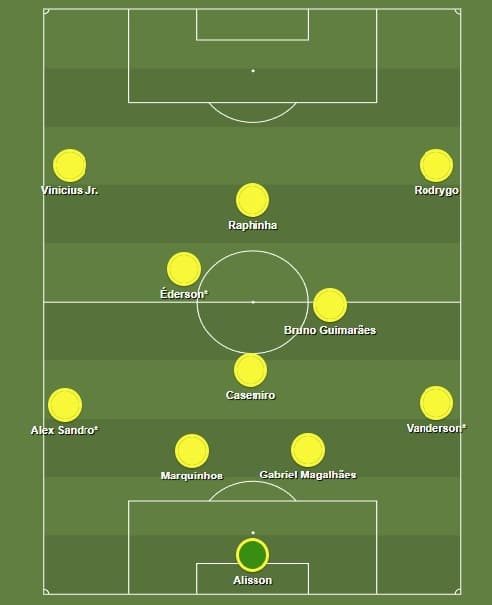 Não é nem preciso estender muito para dizer que Rodrygo e Vinicius Jr. têm uma boa relação com Carlo Ancelotti e já sabem suas ideias. Como Neymar enfrenta diversos problemas físicos, Raphinha deve completar o trio ofensivo do Brasil.