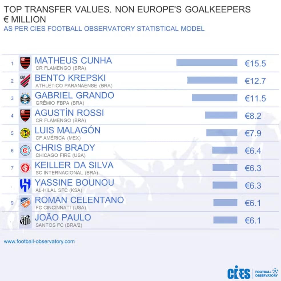 Ainda que não tenha terminado da melhor maneira possível, o ano passado serviu para que Matheus Cunha se consolidasse de vez entre os profissionais do Flamengo e, de quebra, chamasse a atenção de diversos mercados do futebol mundial. O Centro Internacional de Estudos de Esporte (CIES Football Observatory), inclusive, o colocou como o goleiro mais valorizado entre os que não atuam na Europa.