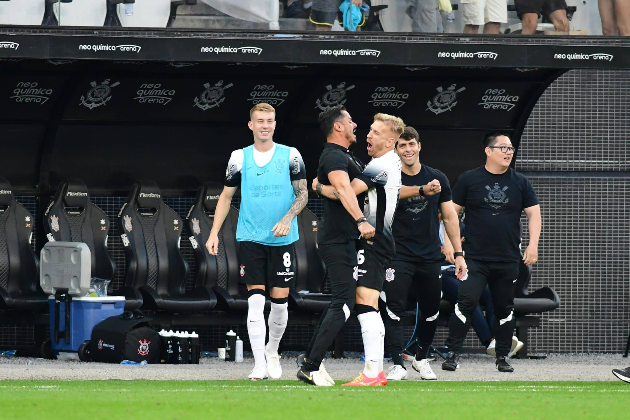 Assim que fez o seu primeiro gol com a camisa do Corinthians, o atacante Pedro Henrique foi diretamente ao banco de reservas e deu um forte abraço no preparador físico Diego Pereira.