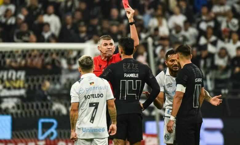 Em um jogo combativo, principalmente no meio-campo, desde o primeiro minuto, o volante corintiano passou do ponto e entrou muito duro na altura do joelho do adversário gremista. Nem precisava do VAR para que o cartão vermelho fosse dado, mas Marcelo, ainda assim, consultou o vídeo e mudou a decisão inicial que foi pelo amarelo.