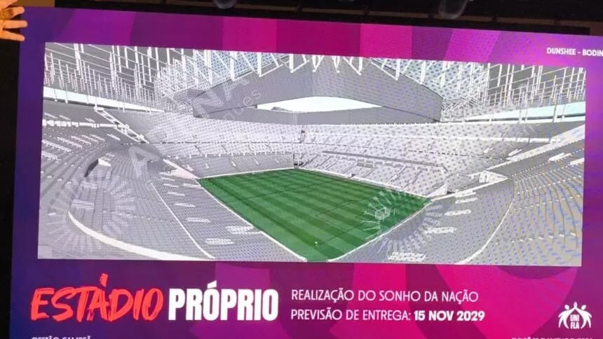 Dunshee, ao lado de Landim e Marcos Bodin, também deu detalhes da primeira projeção do novo estádio do Flamengo. A imagem é ilustrativa, mas pode significar um possível detalhamento de como as obras podem terminar. Para mais informações sobre o projeto, clique no link.