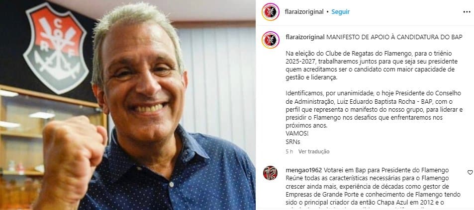 Como mencionado, BAP já conta com o apoio de pelo menos 70 associados no grupo Raiz Original. Recém-formada, a conjuntura é encabeçada por membros do Conselho Deliberativo do Flamengo (CoDe) e Conselho de Administração (CoA).