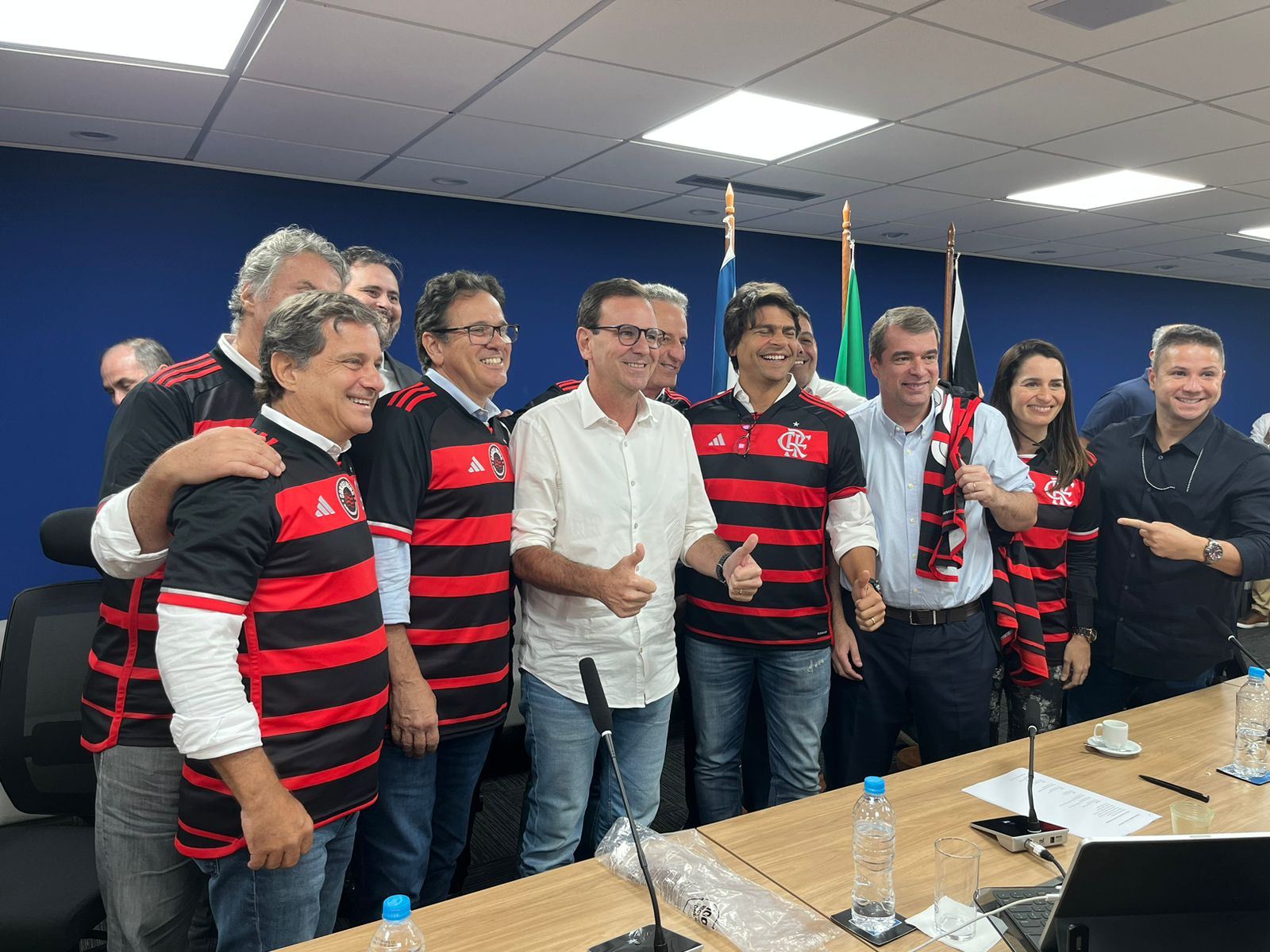 Diretoria do Flamengo veio em peso para a posse do terreno do Gasômetro. Landim e Rodrigo Dunshee estão no palanque com Eduardo Paes e Pedro Paulo.