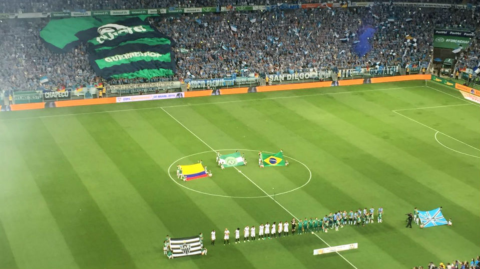 Na entrada de campo, o primeiro sinal da gratidão. Além da bandeira do Brasil e da Chapecoense, também estava presente a da Colômbia. Símbolo maior da união de dois povos que reforçaram seus laços de fraternidade em plena dor. As crianças vestiam camisas da Chape e os árbitros usavam um uniforme especial, verde. Os jogadores das duas equipes traziam o escudo dos catarinenses no peito. E, enquanto a tradicional camisa gigante da Arena Condá se desenrolava nas arquibancadas, os gremistas gritavam com toda a sua força o ‘Vamo vamo Chapê’.