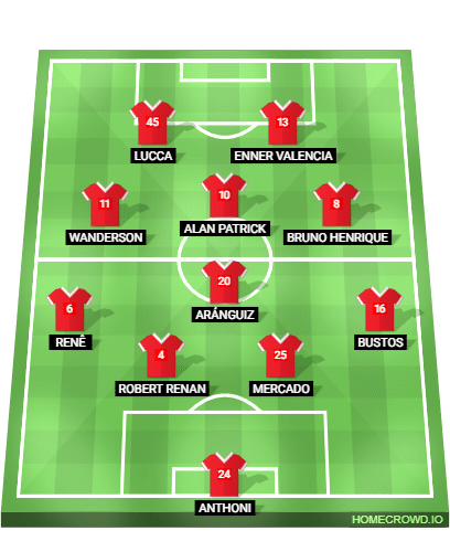 Assim como aconteceu no segundo tempo dos jogos contra Ypiranga, Guarany e Caxias, Alan Patrick iniciou a partida contra o Santa Cruz como meia centralizado, atrás de uma dupla de ataque — neste caso, Enner Valencia e Lucca. Com isso, Bruno Henrique foi deslocado para o lado direito, com Wanderson no lado esquerdo e Aránguiz como primeiro volante, tal qual na etapa final da vitória sobre o Grená.