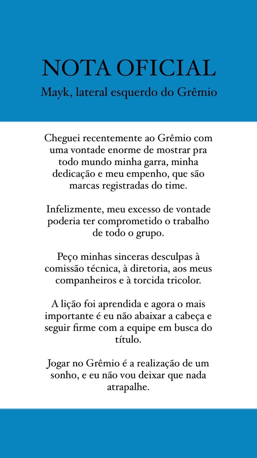 Após sair cabisbaixo e em silêncio da Arena do Grêmio, Mayk se manifestou por meio de nota oficial nesta quarta-feira (27). Ele reconheceu o erro, que atribuiu ao “excesso de vontade”, e pediu desculpa por saber que a expulsão poderia ter comprometido a passagem do Grêmio à decisão do estadual.