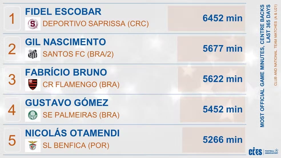 Otamendi, do Benfica, e Gustavo Gómez, do Palmeiras, completam os cinco melhores da lista. É importante frisar que a convocação de Fabrício Bruno contribuiu, sem dúvidas, para a sua minutagem. No recorte, apenas Gil não esteve no grupo de Dorival Júnior.
