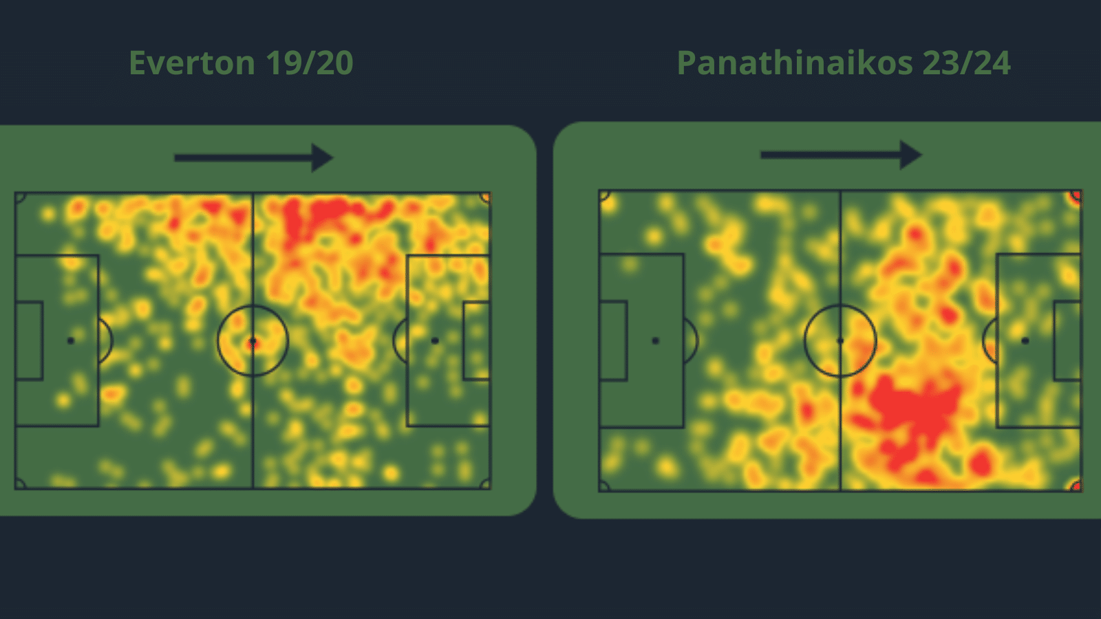 Com o passar do tempo, Bernard ficou claramente mais inteligente jogando, até por isso se tornou um meia-armador, de criação. O mapa de calor do jogador ao longo dos anos mostra bem essa mudança dele. Inclusive, o jogador deixou de atuar mais pelo lado esquerdo e hoje está caindo mais para a direita. Mesmo não sendo mais ponta, é fácil acompanhar jogadas dele mais aperto do que centralizado. Pela agilidade que tem, também é normal ver ele em vários setores do meio-campo.