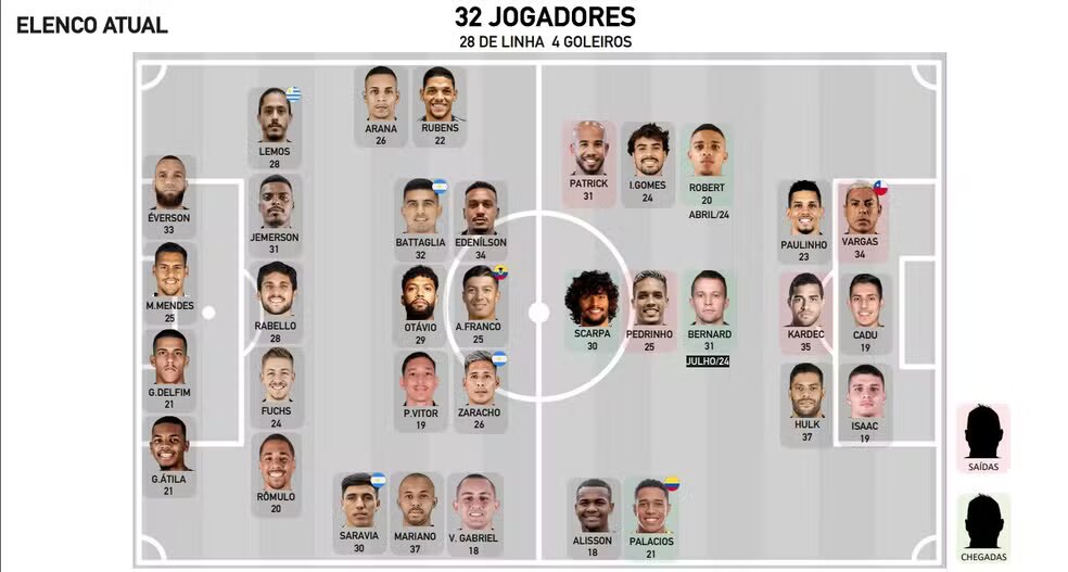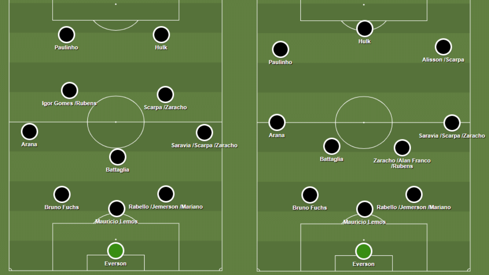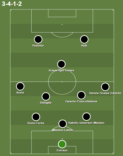 Com três atacantes, o mais óbvio no momento é ter Paulinho, Hulk e Alisson, que são os de mais destaque no momento. Gustavo Scarpa, Pedrinho e Robert (e Bernard) são os meias que podem se adequar ao time como alas. Além deles, o criticado Eduardo Vargas, o recém-chegado Palacios e o jovem Cadu também podem fazer a função.