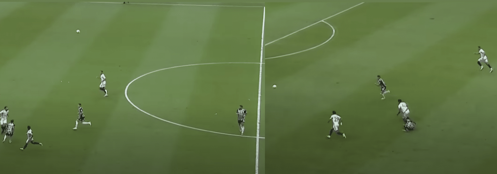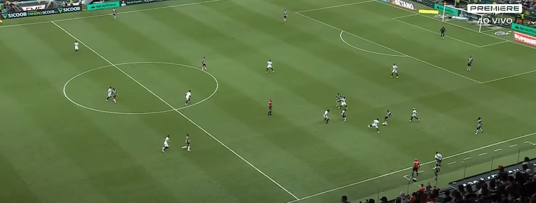 Um exemplo disso é no gol perdido por Paulinho aos 34 minutos. O Cruzeiro estava com as linhas altas, o que deixou uma situação de 3×3 no ataque do Galo, com Paulinho, Hulk e Zaracho. O lançamento então ocorre, com Paulinho e Zaracho atacando a bola e Hulk ficando na sobra, caso o adversário cortasse. O argentino ganhou de cabeça e a bola sobrou para Paulinho entre dois defensores espaçados, mas ele acabou desperdiçando a chance após tentar dois dribles