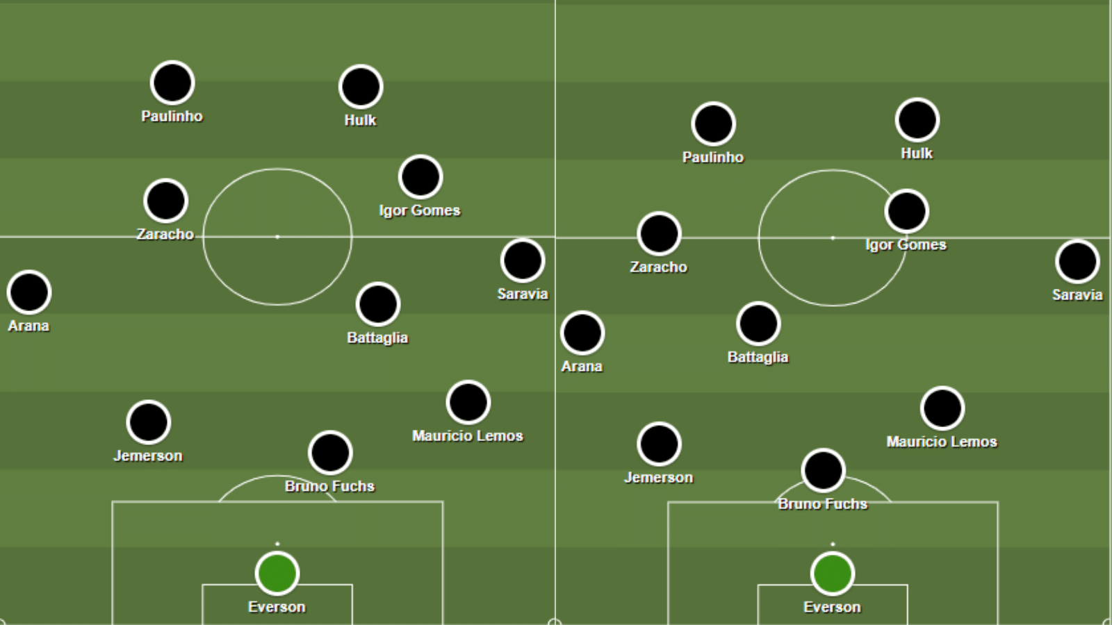 Com essa aproximação feita, começava a triangulação e as movimentações intensas. No lance do gol de Hulk, por exemplo, Arana recebeu aberto e tocou para Zaracho, que devolveu a ele de primeira, já postado mais para o centro do que para a linha lateral, e Arana também tocou de primeira já buscando Paulinho. A bola não chegou no camisa 10, que estaria no mano a mano, mas passou e foi parar nos pés de Hulk, que também estava no 1×1, e ganhou na corrida.
