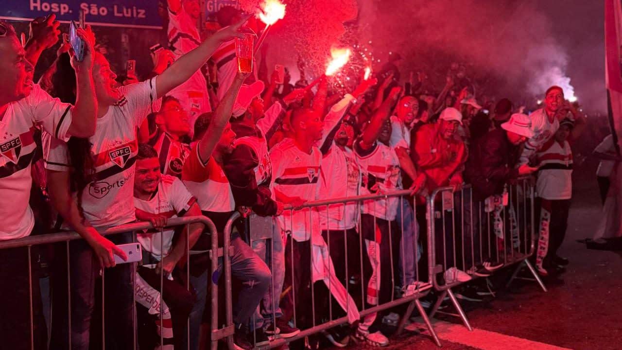 Com a chegada do ônibus, a festa ganhou ares apoteóticos. Os torcedores explodiram em cantos e gritos de guerra, enquanto o vermelho coloria os céus do bairro do Morumbi com sinalizadores, fogos e fumaça.